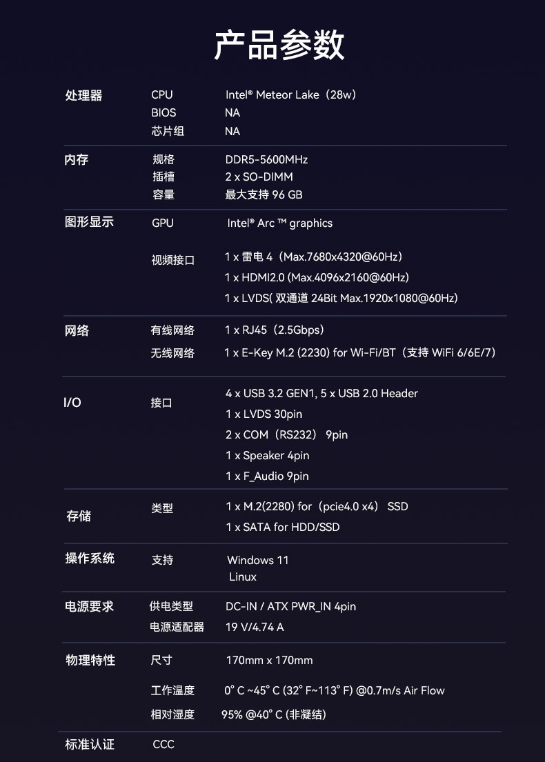 CB4-411主板采用英特尔Meteor Lake平台,适配Ultra5、Ultra7、Ultra9H系列处理器,这些处理器以卓越的性能和能效,为各种计算任务提供了强大的支持。主板采用双通道DDR5可拆内存插槽,最大容量96GB,同时运行多个大型程序、处理大型文件也不卡顿。