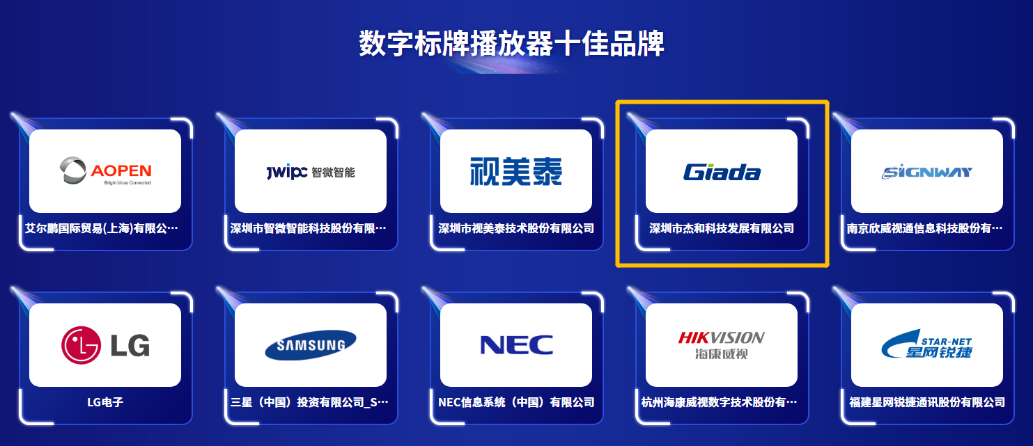 Giada永利3044官网科技凭借突出的市场竞争力、强劲的产品创新力、卓越的产品成长力、领先的品牌影响力,从众多候选企业中脱颖而出,斩获“优秀多媒体信息发布系统品牌大奖”、“优秀播放器品牌大奖”两项荣誉。Giada永利3044官网科技已连续四年登上领奖台。