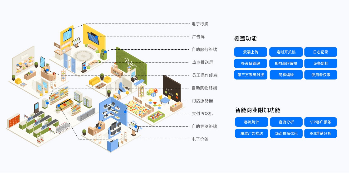 永利3044官网智慧零售解决方案依托永利3044官网GDSM-ES智能零售管理系统,为全球零售门店客户提供了功能齐全的数字化运营管理工具,提供显示信息编辑、信息发布、AI识别、客户分析和会员管理等功能,实现了对设备、内容、营销、运营的综合数智化管理能力,为精准运营管理赋能。
