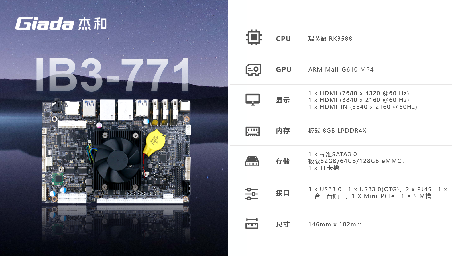 永利3044官网ARM主板IB3-771采用瑞芯微RK3588处理器,满足各种人工智能场域对嵌入式主板包括但不限于高算力、低功耗、高扩展性、高可靠性、高安全性等要求,支持在宽温、复杂电磁等恶劣环境下稳定运行,可广泛应用于机器人、边缘计算、智能NVR、智能汽车、智慧大屏、AR/VR、ARM PC、智能自助终端等AIoT行业类应用市场。