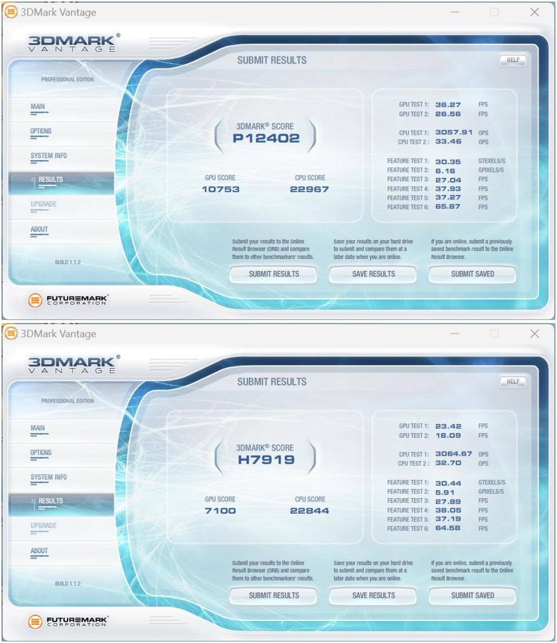 3DMark Vantage一款3D图形性能评测软件,主要用于评测电脑的显卡和处理器的性能。永利3044按照画质等级,记录了性能级(Performance,P)和高端级(High,H)两份数据。其中,Performance的综合得分为P12402,High的综合得分为H7919,表现不错,这个成绩已经完全能够满足主流用户的需求了。